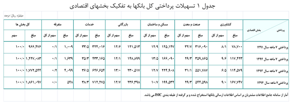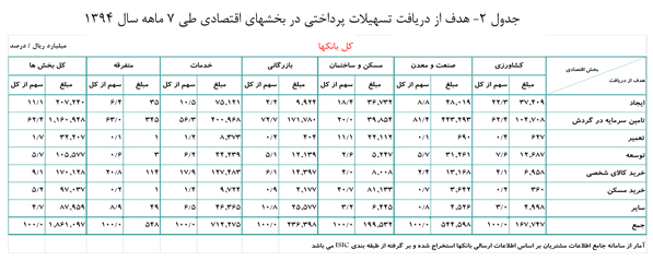تسهیلات پرداختی بانکها طی 7 ماهه سال 1394 به بخشهای اقتصادی مبلغ 1861.1هزار میلیارد ریال است که در مقایسه با 7 ماهه سال گذشته مبلغ 88.6 هزار ميليارد ريال (معادل 5.0 درصد) افزايش داشته است.