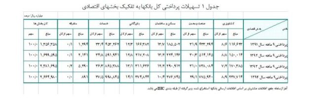 تسهیلات پرداختی بانکها طی 9 ماهه سال 1394 به بخش های اقتصادی مبلغ 2665.0هزار میلیارد ریال است که در مقایسه با 9 ماهه سال گذشته مبلغ 283.3هزار ميليارد ريال (معادل 11.9 درصد) افزايش داشته است.