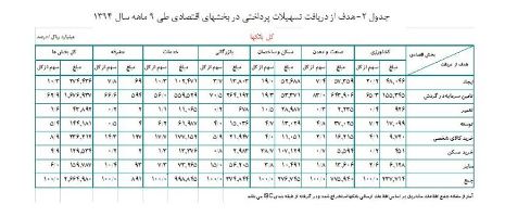 جدول شماره 2 بیانگر هدف از دریافت تسهیلات پرداختی در بخشهای اقتصادی طی 9 ماهه سال جاری است. سهم تسهیلات پرداختی در قالب سرمایه در گردش در کلیه بخشهای اقتصادی طی 9 ماهه سال جاری مبلغ 1676.9 هزار میلیارد ریال معادل 62.9 درصد کل تسهیلات پرداختی است که در مقایسه با 9 ماهه سال گذشته مبلغ 248.4 هزار میلیارد ریال معادل 17.4درصد افزايش داشته است.