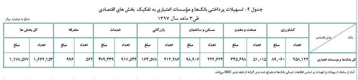 به گزارش روابط عمومی بانک مرکزی تسهیلات پرداختی بانکها طی 3 ماهه سال 1397 به بخشهای اقتصادی مبلغ 1178.6 هزار میلیارد ریال میباشد که در مقایسه با دوره مشابه سال قبل مبلغ 165.0 هزار ميليارد ريال (معادل 16.3 درصد) افزايش داشته است.